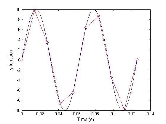 10 sin (100 t) using Matlab with two different resolutions on the same plot: 10 points per period and